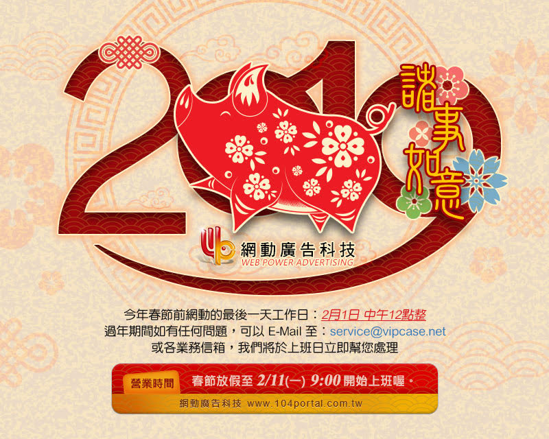 網動的大家從2019/02/01,中午12:30開始春節假期,至02/11(一)09:00開始上班囉~